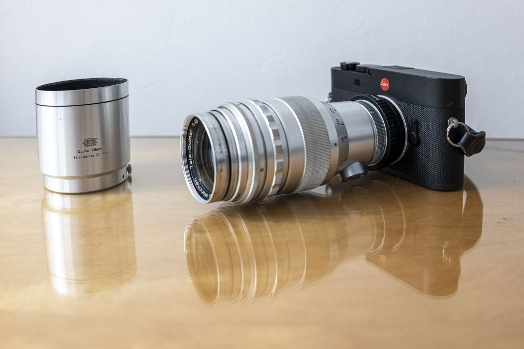 Für dieses Experiment habe ich ein 70 Jahre altes Steinheil Objektiv ausgewählt. Ganz einfach deswegen, weil ich die 200 Millimeter Brennweite unbedingt an der Leica M EV1 einmal ausprobieren wollte. Beim Tele-Quinar 200mm f/4.5 handelt es sich um ein Glas, das vom Münchner Hersteller C.A. Steinheil & Söhne 1956 in mehreren Anschlussvarianten auf den Markt gebracht wurde, meine Version hat ein M42 Anschluss und lässt sich mit einem M42/M-Adapter daher easy an der EV1 nutzen. Typisch für das Tele-Quinar sind die 14 Lamellen, die für sehr runde Unschärfekreise sorgen – ein Grund für das oft gelobte Bokeh. Optisch also eher „klassisch“ als klinisch: moderate Schärfe, niedriger Kontrast, aber sehr angenehme Hintergrundauflösung – typisch für Steinheile dieser Zeit (falls Du interessiert bist, ich biete es hier auf Kleinanzeigen aus erster Hand – aus dem Nachlass einer Bekannten – an).